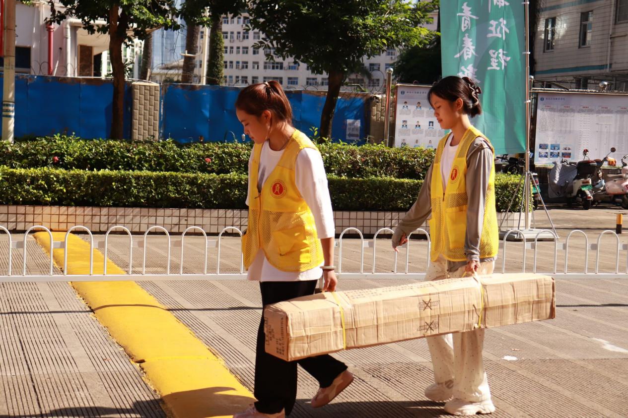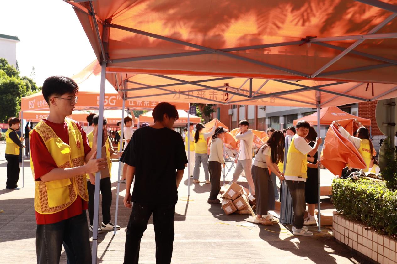 烈日下,志愿者们分工明确:搬运组一趟趟往返,将桌椅精准归位;搭建组默契配合,帐篷在空地“拔地而起”。螺丝拧紧的脆响、帐篷撑开的簌簌声,交织成迎新前的独特乐章。尽管汗水湿透衣背,大家却笑着说:“多搭一顶帐篷,萌新就多一份清凉!”