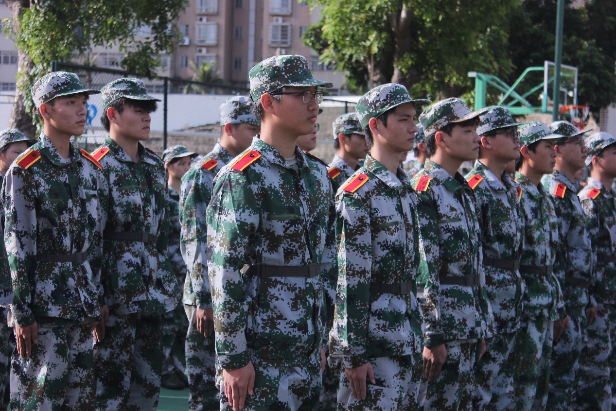 烈日如无形的巨掌,裹挟着热浪,迷彩服早已被汗水浸湿,顺着下额线滚落的汗珠落在地面上瞬间被蒸发,但新生们的训练热情丝毫未减。“稍息”“立正”“跨立”等基础动作都力求规范。“坚持住”“动作再快点”教官的口令钪锵有力,新生们的回应坚定响亮。嘹亮的口号在训练场响彻云霄