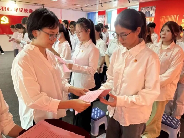 授徽颁证环节后,林丽媛老师为每位新团员送上定制的青春承诺卡。新团员们接过卡片,认真翻阅并郑重签下自己的姓名。落笔的瞬间,既是对入团初心的定格,更是对未来践行青春使命的庄严承诺,一张张卡片承载着青年们对理想的追求、对组织的忠诚,成为本次仪式中极具意义的纪念。