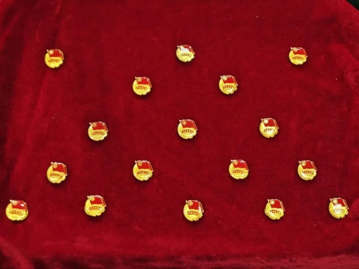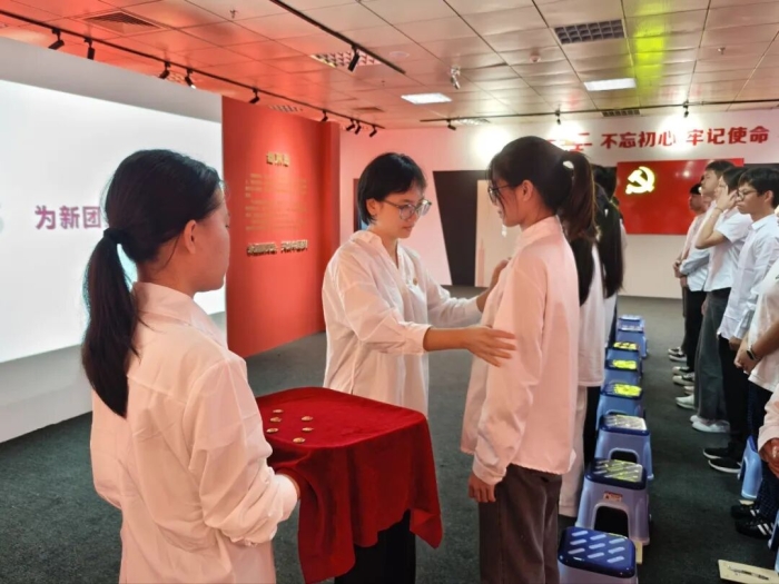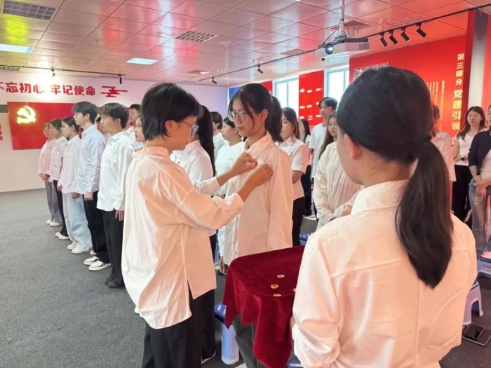 依次为新团员佩戴团徽