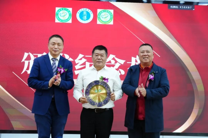 朱世军和胡文光共同为唐捷颁发景泰蓝纪念盘