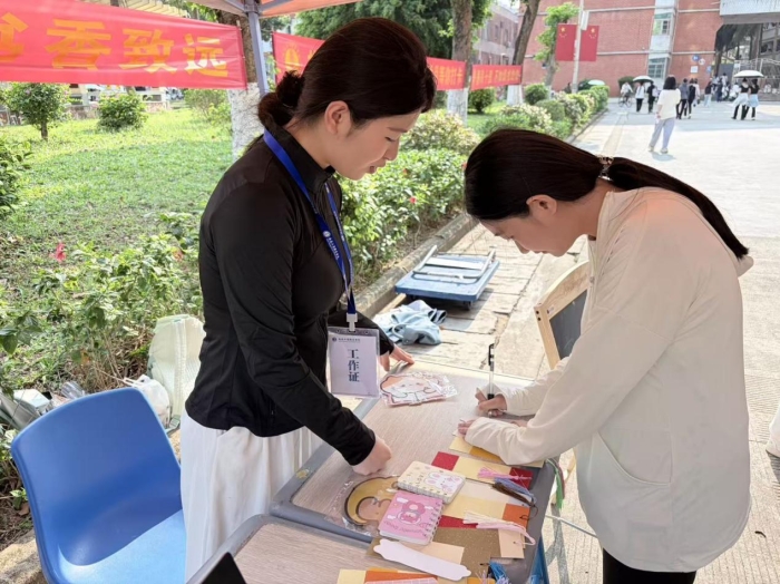 活动现场,工作人员早早布置好了温馨的阅读分享区,准备了彩色信笺、精致玻璃瓶、书签、笔记本、文创笔等丰富材料,为同学们打造了一个沉浸式的阅读分享空间。同学们围聚在桌前,或低头思索,或提笔疾书,将自己与书籍的故事细细写在信笺上。有人写下《平凡的世界》里孙少平那句“只有劳动才能使人在生活中强大。”标注着“送给正在努力的自己”。